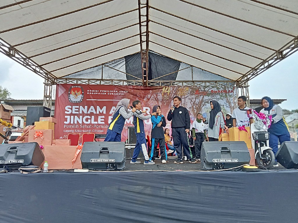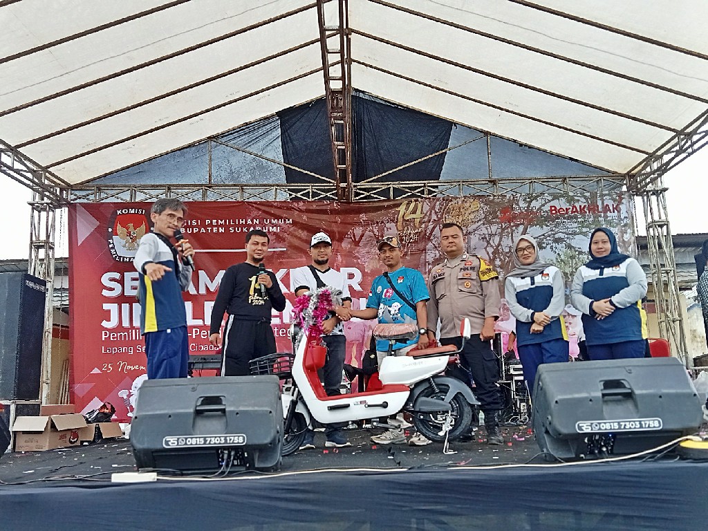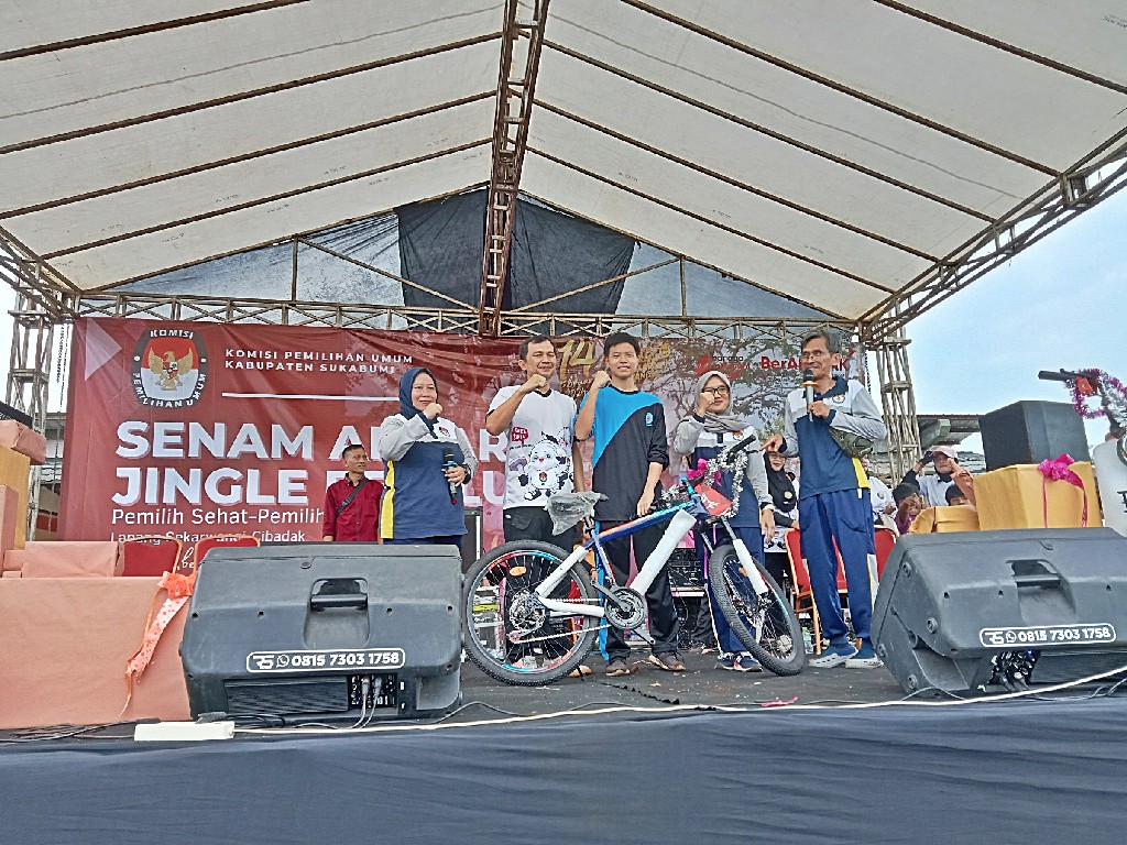 Senam Akbar Jingle Pemilu 2024, semakin meriah dengan hadiah Doorize yang disiapkan KPU Kabupaten Sukabumi, seperti sepeda listrik, sepeda gunung, kulkas, kompor gas, dan alat-alat kebutuhan keluarga lainnya.