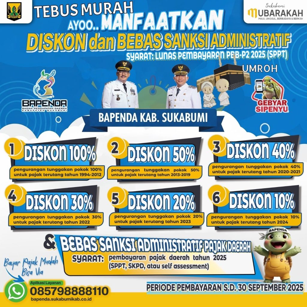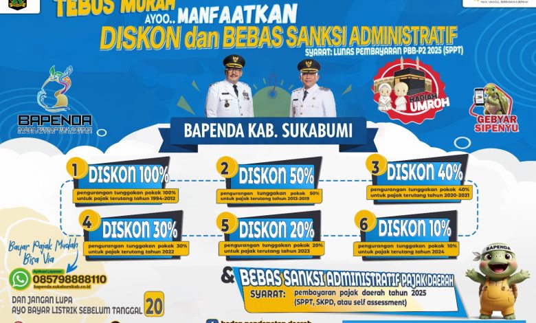 Elmitra News – Badan Pendapatan Daerah (Bapenda) Kabupaten Sukabumi membuat gebrakan baru lagi untuk masyarakat kabupaten sukabumi melalui sebuah program Pengurangan Pokok Pajak Bumi dan Bangunan-Pedesaan dan Perkotaan ( PBB-P2), serta Pembebasan atas sanksi administratif dengan syarat membayar PBB-P2 Tahun 2025.