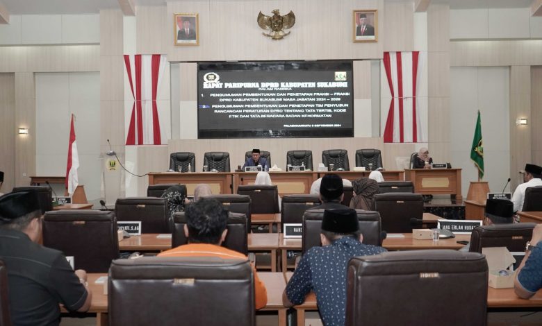 Berdasarkan hal tersebut serta memperhatikan surat usulan dari masing-masing partai politik yang ada di DPRD Kabupaten Sukabumi, Maka atas pertimbangan sebagaimana tersebut, dalam kesempatan ini, kami umumkan Pembentukan Fraksi-Fraksi DPRD Kabupaten Sukabumi Masa Jabatan 2024-2029, sebanyak 7 (tujuh) Fraksi, yaitu Fraksi Partai Golkar, Fraksi Partai Gerindra, Fraksi PKB, Fraksi PKS, Fraksi PDI-P, Fraksi Partai Demokrat, Fraksi PPP dan untuk Anggota DPRD berasal dari PAN bergabung dengan Fraksi Partai Golkar.