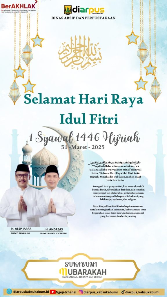 Elmitra News – Dinas Arsip dan Perpustakaan (Diarpus) Kabupaten Sukabumi Mengucapkan Selamat Merayakan Idul Fitri 1 Syawal 1446 Hijriah “Semoga kebahagian, kedamaian, dan keberkahan selalu menyertai kita semua”