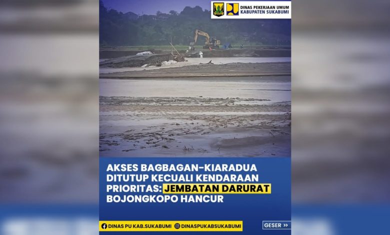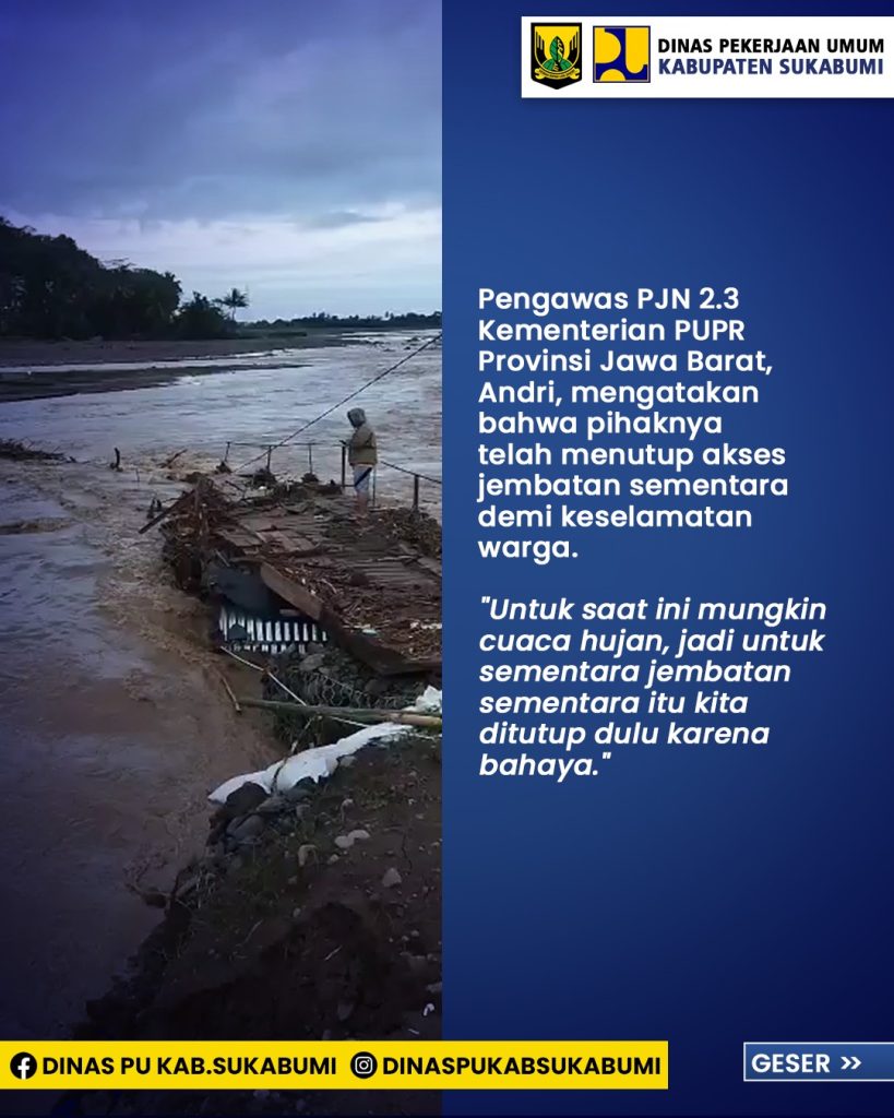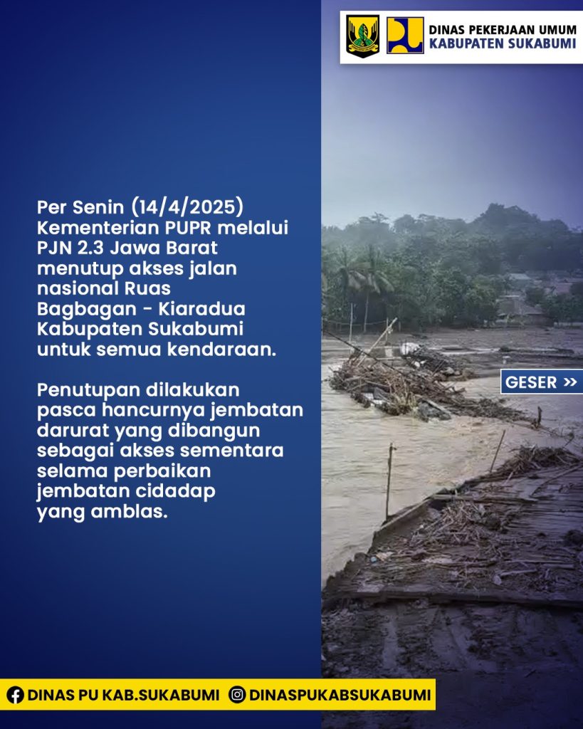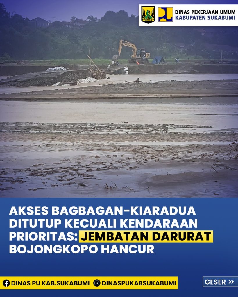 Elmitra News – Senin dinihari luapan sungai cidadap setelah wilayah sukabumi dilanda hujan deras sejak minggu siang menghancurkan jembatan darurat dibangun sejak 18 Maret 2025. Hancurnya jembatan darurat ini membuat kendaraan roda empat kecil dan roda sama sekali tak bisa melintasi jalan nasional Bagbagan – Kiaradua, di Kecamatan Simpenan Kabupaten Sukabumi.