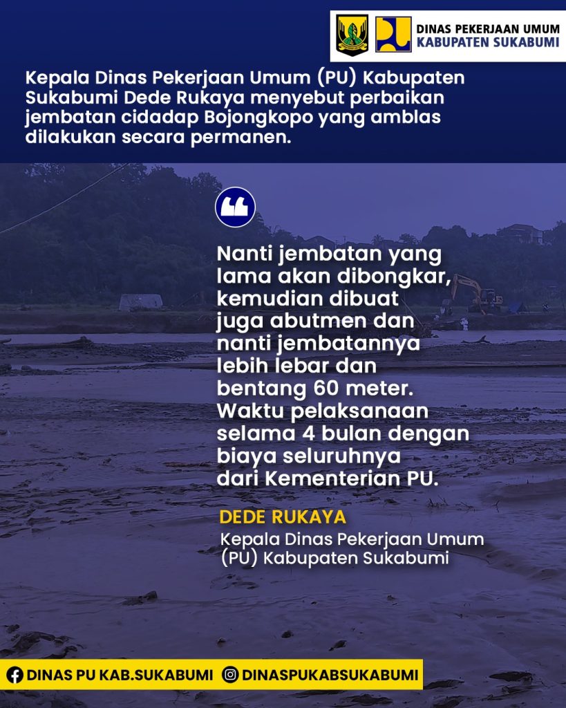 Dede mengatakan, penanganan permanen nantinya dilakukan BBPJN DKI Jakarta-Jawa Barat dengan mengganti konstruksi jembatan yang lama menjadi lebih lebar dengan panjang bentang 60 meter. Diketahui, Jembatan Cidadap Bojongkopo yang amblas ini dibangun tahun 1992, dengan panjang bentang 50 meter.