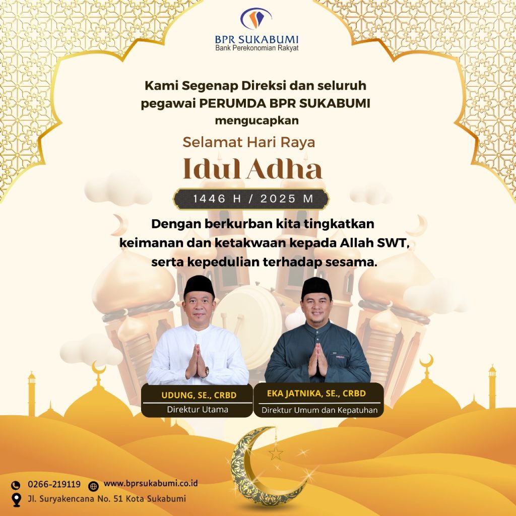 Elmitra News – Perumda BPR Sukabumi Mengucapkan Selamat Hari Raya Idul Adha – 10 Dzulhijjah 1446 Hijriah “Dengan Berkurban, Kita Tingkatkan Keimanan dan Ketakwaan Kepada Allah Swt, serta Kepedulian Terhadap Sesama”