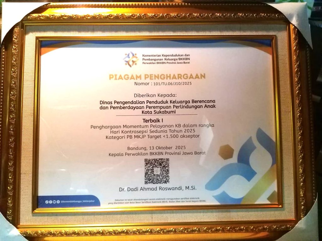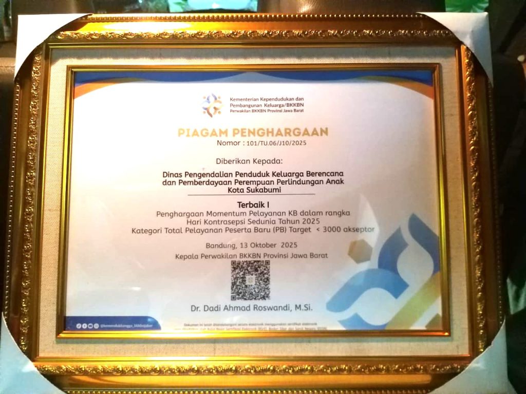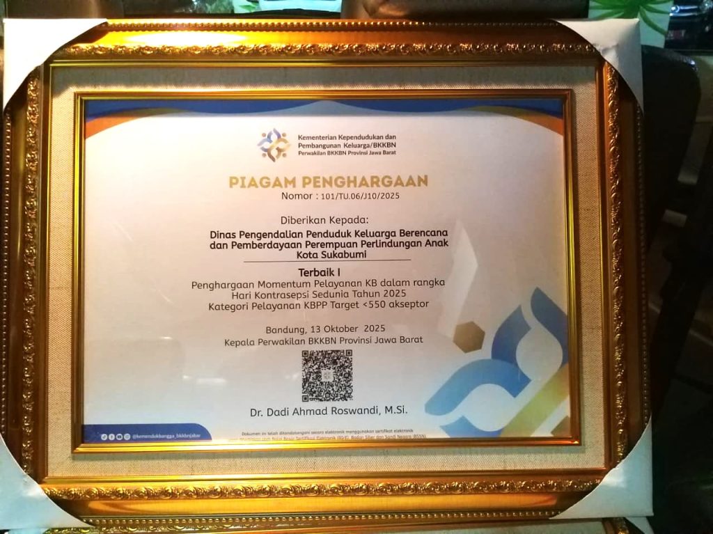 Melalui ajang penghargaan yang digelar oleh Kemendukbangga Provinsi Jawa Barat tahun 2025, DP2KBP3A Kota Sukabumi berhasil meraih sejumlah penghargaan bergengsi yang membanggakan Kota Sukabumi. Dalam rangka Peringatan Hari Kontrasepsi Sedunia Tahun 2025, untuk kategori Pelayanan KBPP dengan target 551 s.d. 1.500 akseptor.