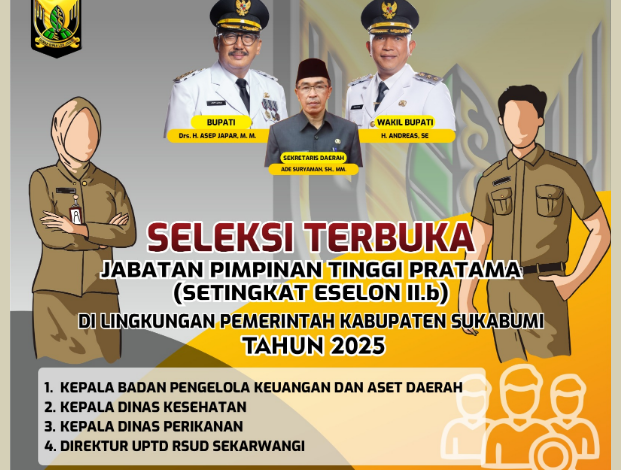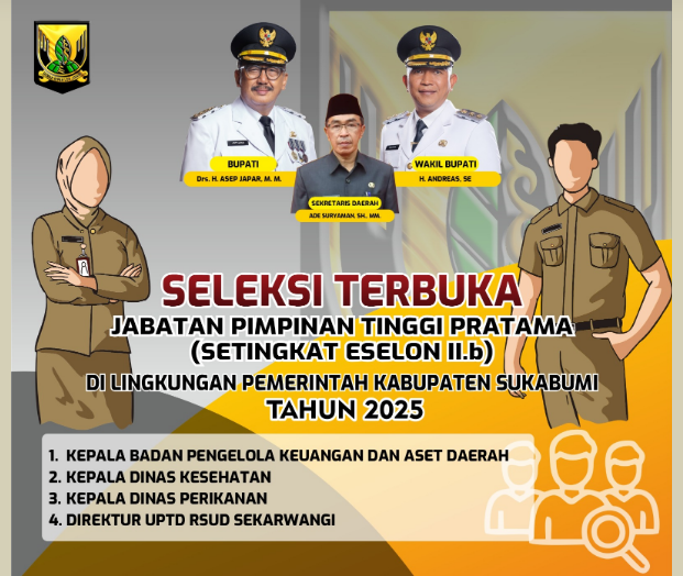 Elmitra News – Sejak dibuka pengumuman pendaftaran Seleksi Terbuka (Selter) pada 28 Oktober 2025 untuk pengisian Jabatan Pimpinan Tinggi (JPT) Pratama setara eselon II-b, akhirnya Panitia Selter Pemkab Sukabumi mengumumkan daftar para pejabat yang telah mendaftar dan dinyatakan lolos seleksi administrasi dan penelusuran rekam jejak.