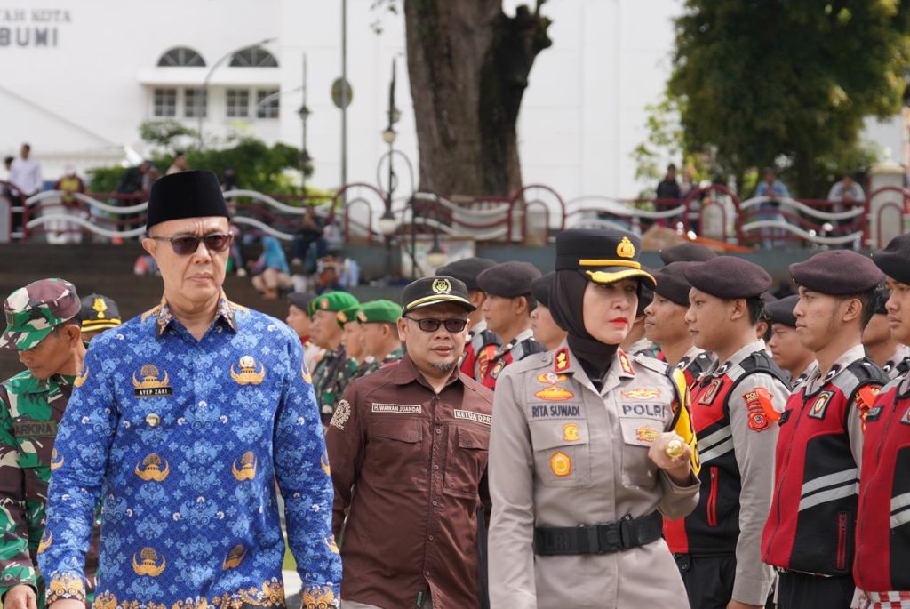 Dalam kesempatan tersebut, Wali Kota Sukabumi Ayep Zaki bersama Kapolres Sukabumi Kota memeriksa kesiapan pasukan gabungan terdiri dari TNI, Polri, Dishub, Pol PP, serta unsur-unsur lainnya.