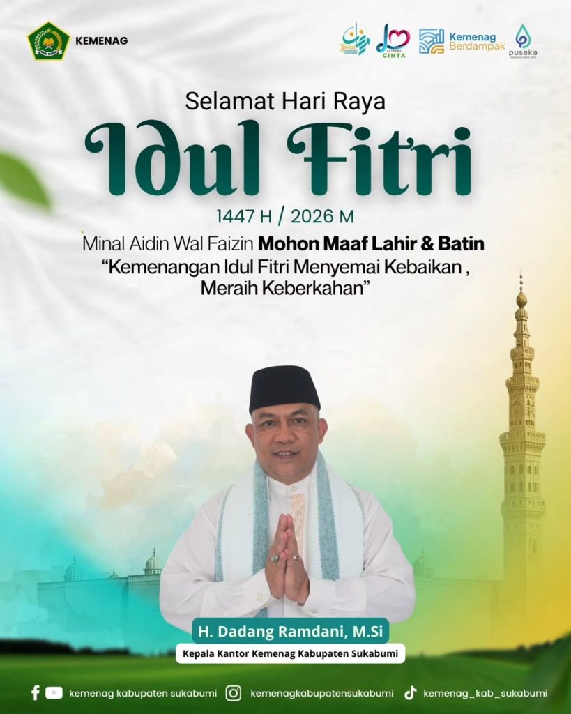 Elmitra News – Kepala Kantor Kementerian Agama (Kemenag) Kabupaten Sukabumi, H. Dadang Ramdani beserta Keluarga Besar Mengucapkan Selamat Hari Raya Idul Fitri 1 Syawal 1447 H / 2026 M