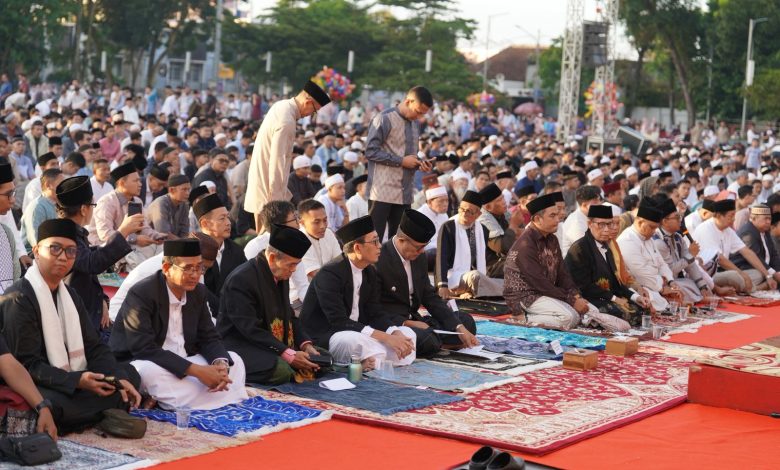 Elmitra News – Ribuan jamaah memadati Lapangan Merdeka Kota Sukabumi pada pelaksanaan Salat Idulfitri 1447 H, Sabtu (21/03/2026) pagi. Bertindak sebagai imam, K.H Ma’mun Abdurrahman, sementara khutbah Idulfitri disampaikan oleh Dr. H. Aab Abdullah yang juga menjabat sebagai Ketua Orda ICMI Kota Sukabumi.