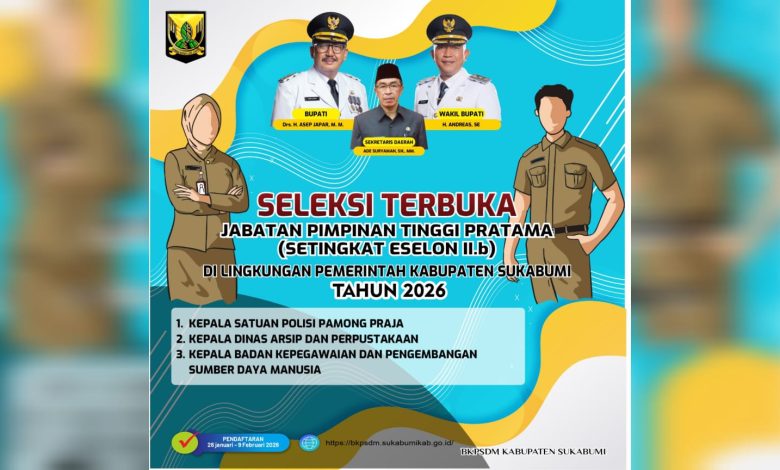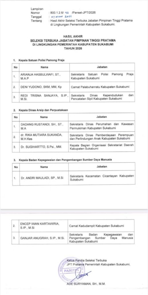 Elmitra News – Pemerintah Kabupaten Sukabumi resmi mengumumkan hasil akhir seleksi terbuka Jabatan Pimpinan Tinggi (JPT) Pratama Tahun 2026. Pengumuman tersebut menjadi bagian penting dari komitmen daerah dalam memperkuat sistem merit ASN yang profesional, transparan, dan akuntabel.