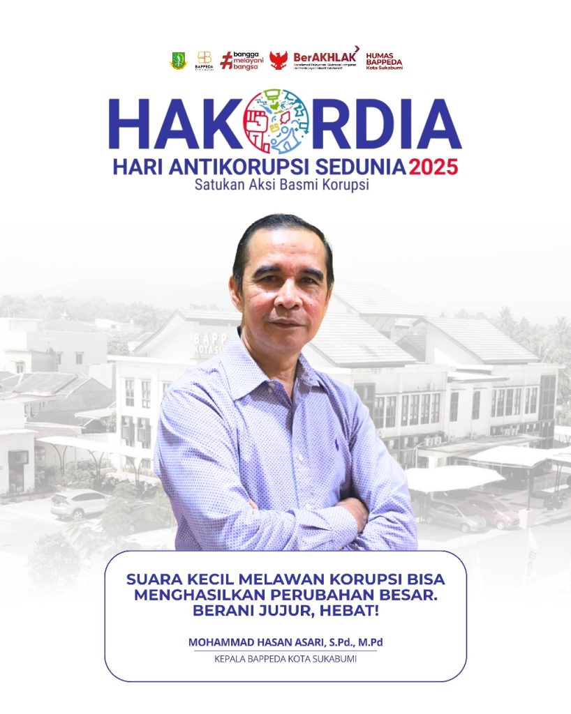 Elmitra News – Kepala Bappeda Kota Sukabumi, M. Hasan Asari Mengucapkan Selamat Memperingati Hari Anti Korupsi Sedunia (HAKORDIA) tahun 2025, yang diperingati setiap tanggal 09 Desember.