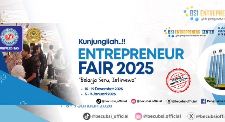 elmitra news – Kampus Universitas BSI kampus Sukabumi akan menyelenggarakan Entrepreneur Fair 2025 Sukabumi, acara tersebut akan di laksanakan pada tanggal 17 – 18 Desember 2025 pada pukul 09.00–15.00 WIB