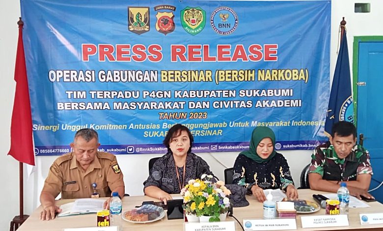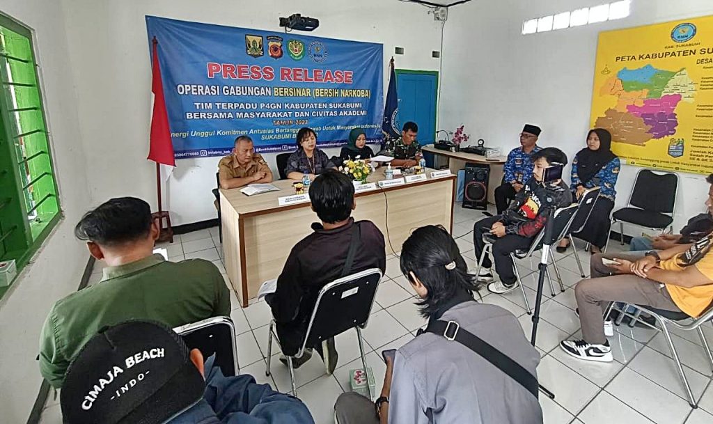 Radio Elmitra News – Badan Narkotika Nasional Kabupaten (BNNK) Sukabumi menggelar konferensi pers Operasi Gabungan “BERSINAR” Bersih Narkoba Tim Terpadu P4GN Kabupaten Sukabumi bersama Civitas Akademika dan Masyarakat Tahun 2023.