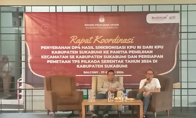 Radio Elmitra News – Komisi Pemilihan Umum (KPU) Kabupaten Sukabumi menggelar Rapat Koordinasi Penyerahan DP4 Hasil Sinkronisasi KPU RI dari KPU Kabupaten Sukabumi Ke Panitia Pemilihan Kecamatan (PPK) Se-kabupaten Sukabumi dan Persiapan Pemetaan TPS Pilkada Serentak tahun 2024 di Kabupaten Sukabumi.